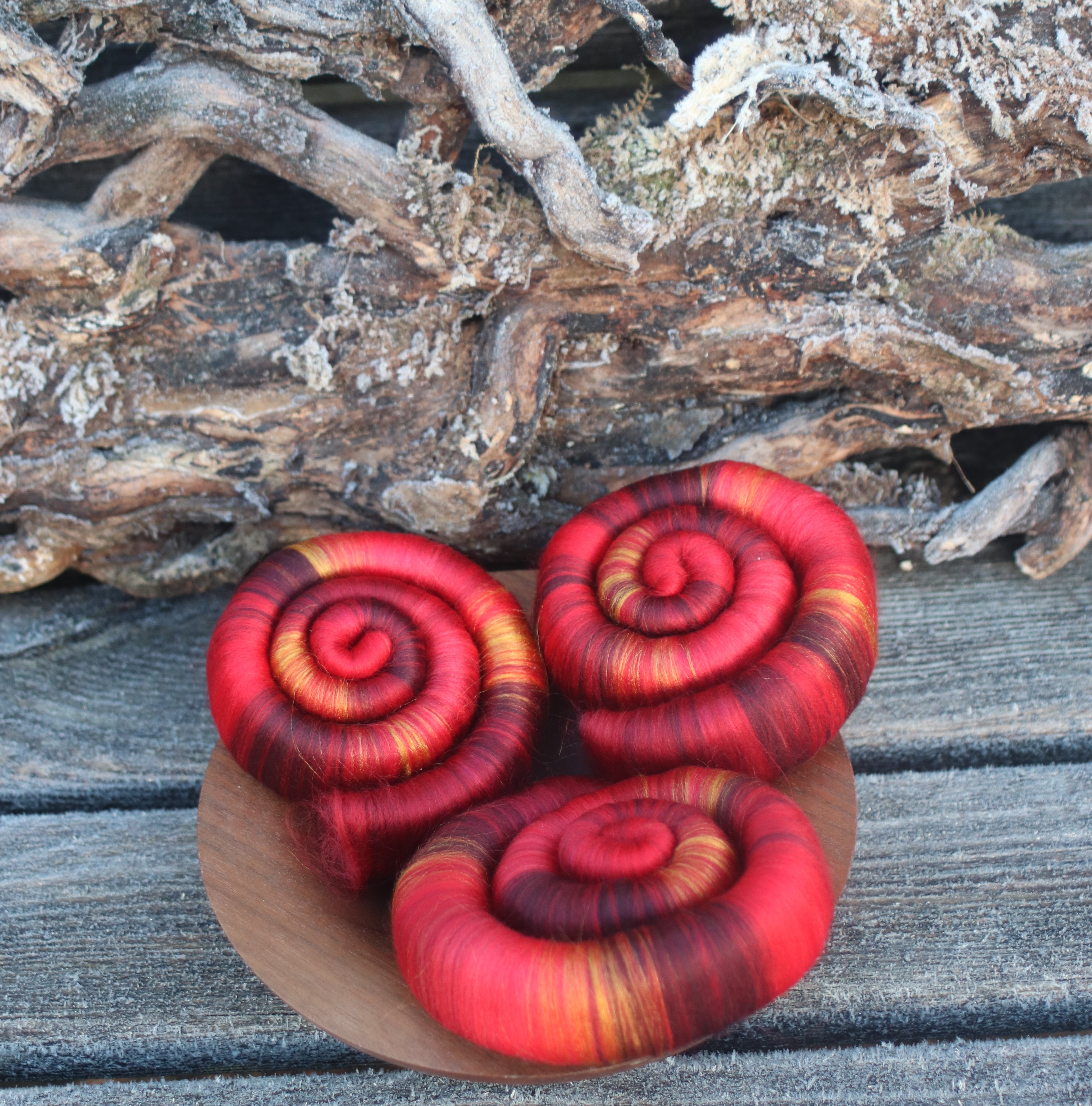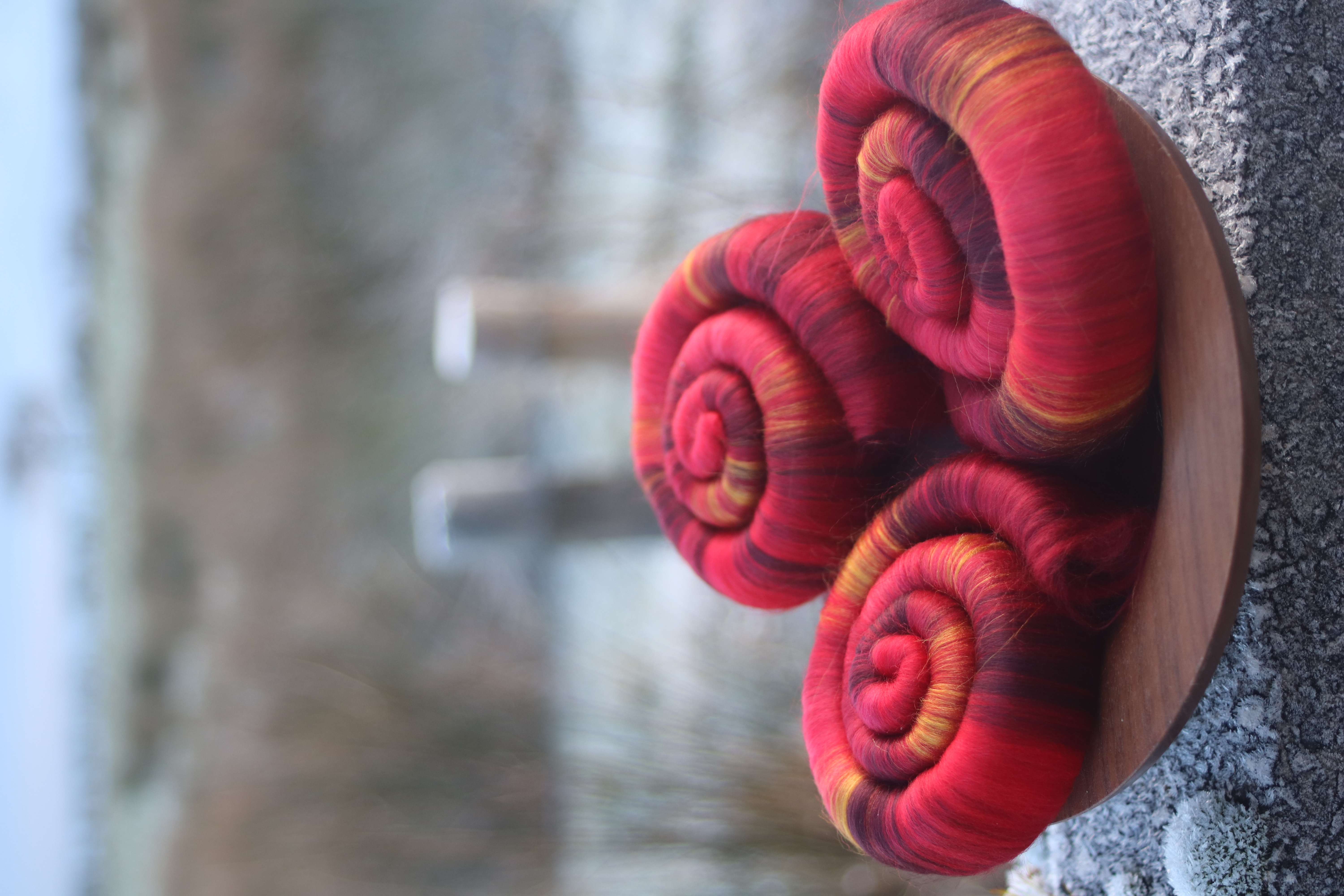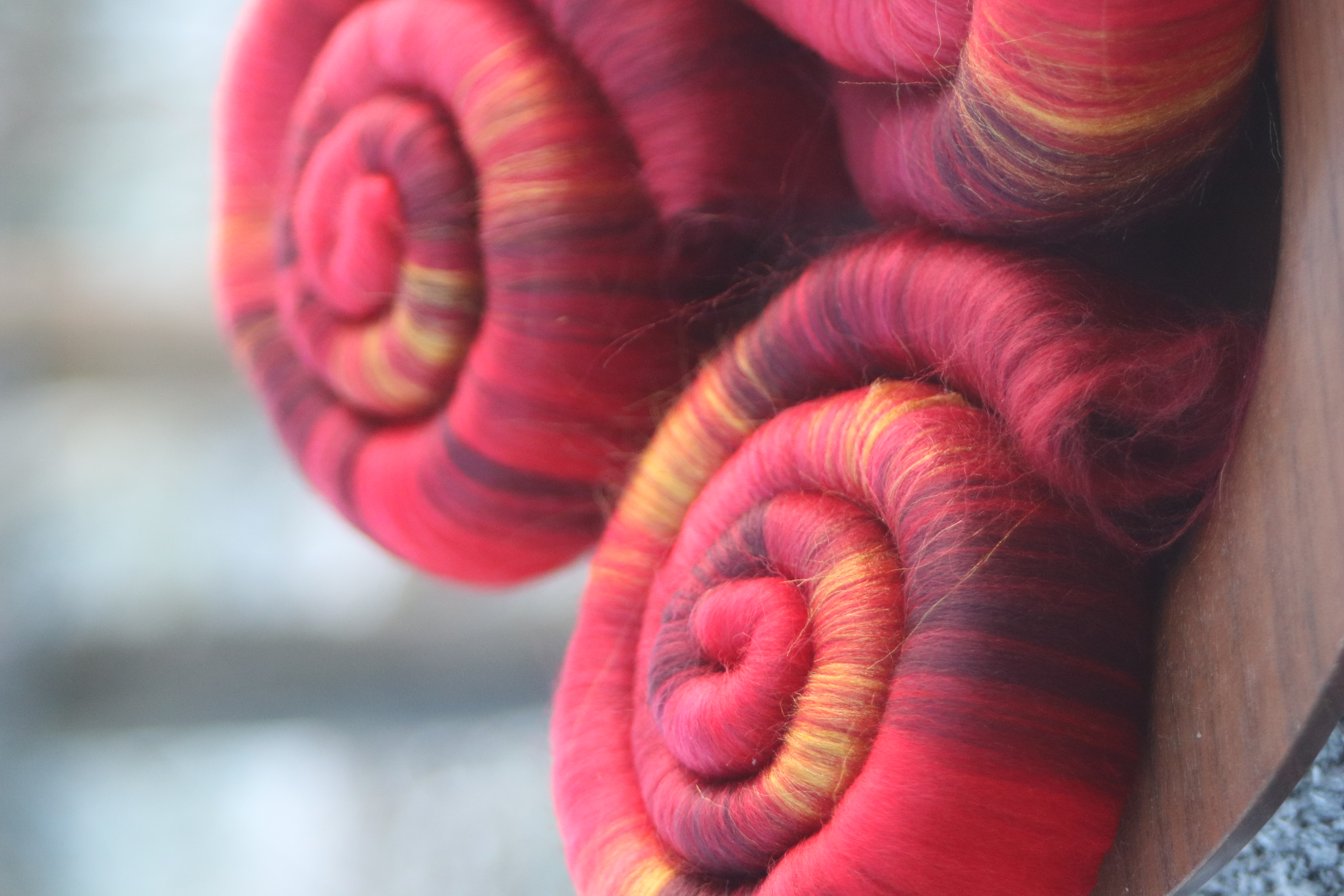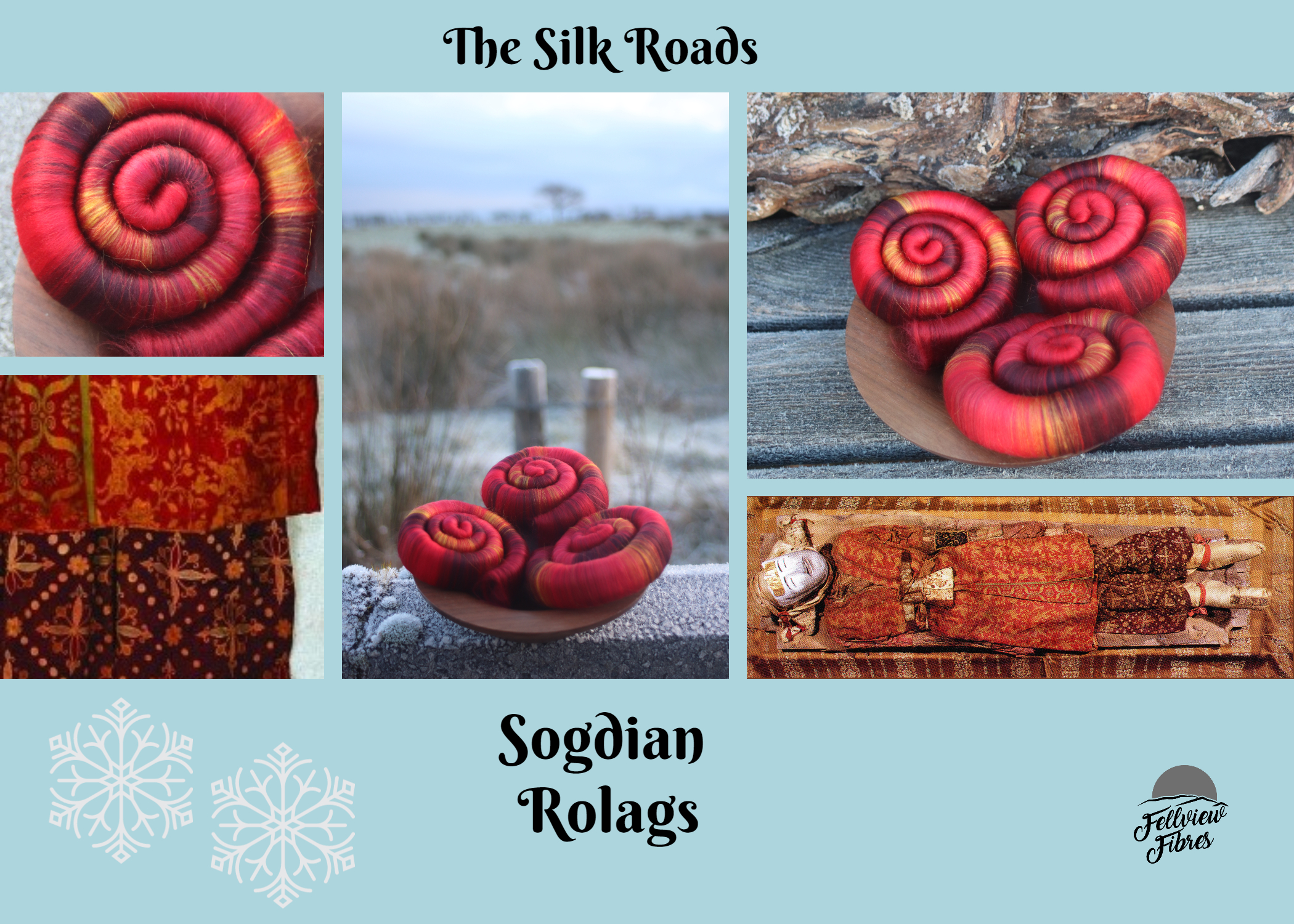 These rich, red rolags are the final in a series of rolags based on the theme of 'The Silk Roads'. I decided that I would base this colourway on some ancient textiles found along the Silk Routes