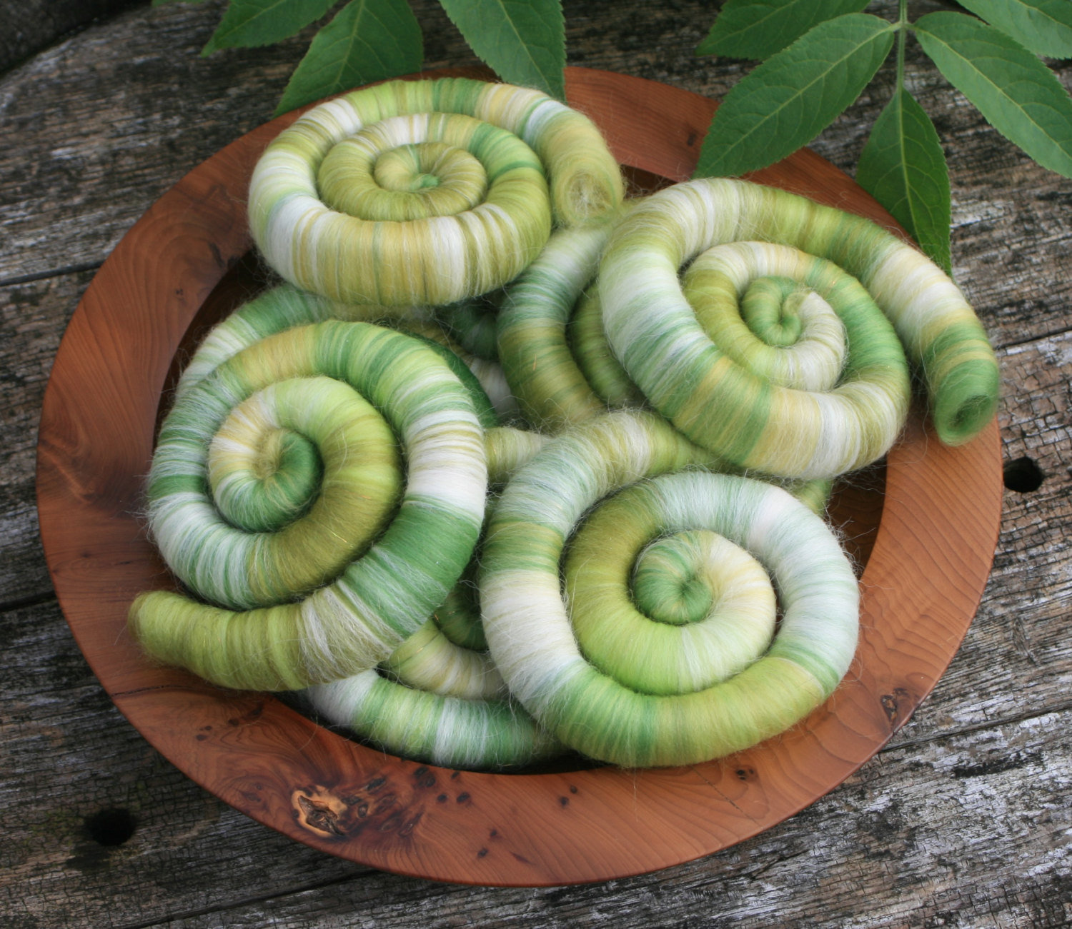 These colours remind me of leaves in bud, ready to burst forth in spring. These rolags are made from beautifully soft 21 micron merino in shades of soft citrus greens, blended with white baby llama. The llama makes this blend especially soft and warm, and will give the resulting yarn a gorgeous halo and drape.
