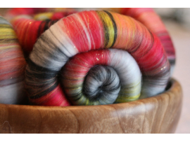 I made these rolags for a good friend. For the first time, I have used some fabric as the inspiration for the rolags. I am really pleased with how the rolags have turned out.