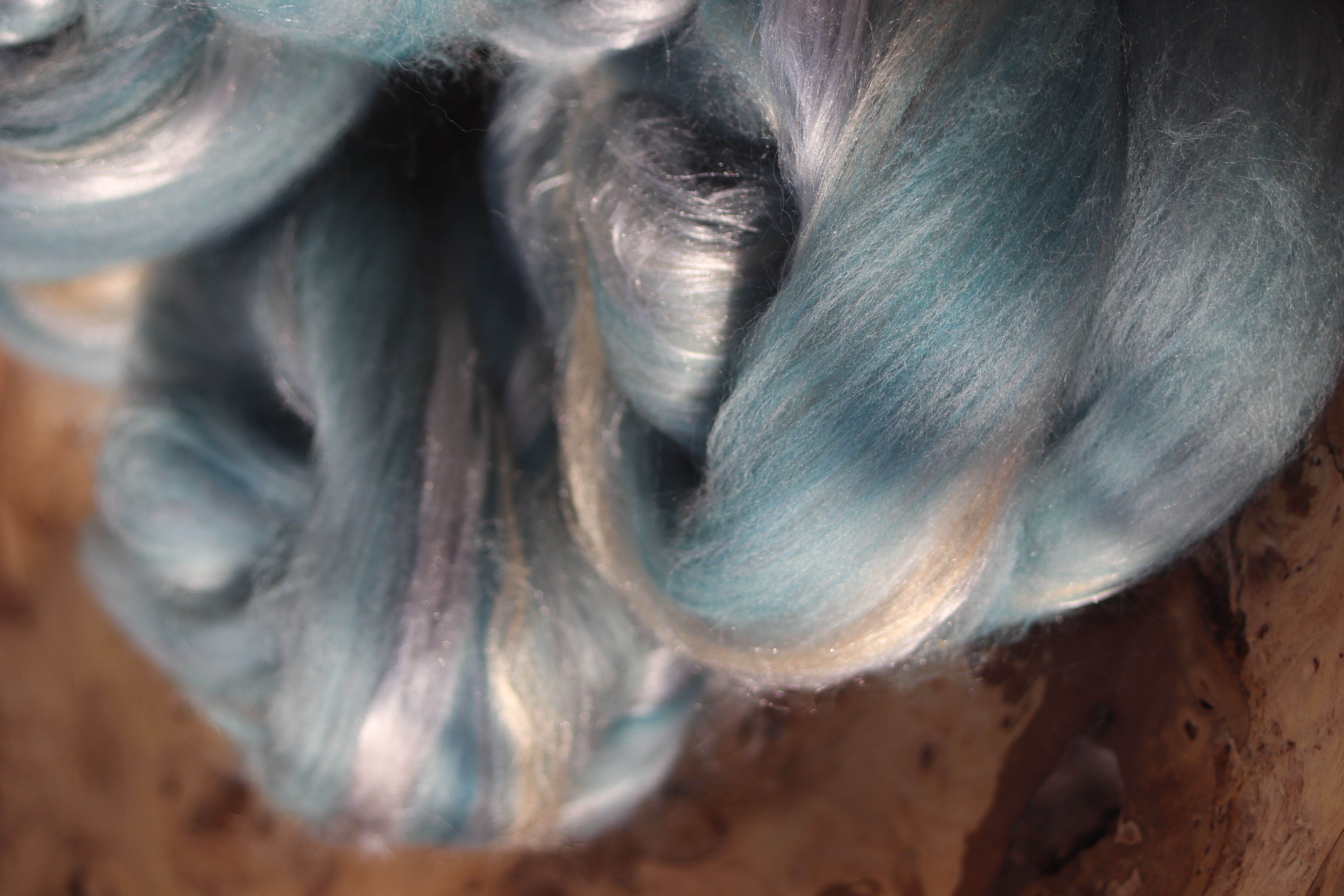 The hand pulled rovings are a lucious, luxury blend of superfine (18.5 micron) merino in shades of teal and grey, with added gold using Muga silk and silver mulberry silk.