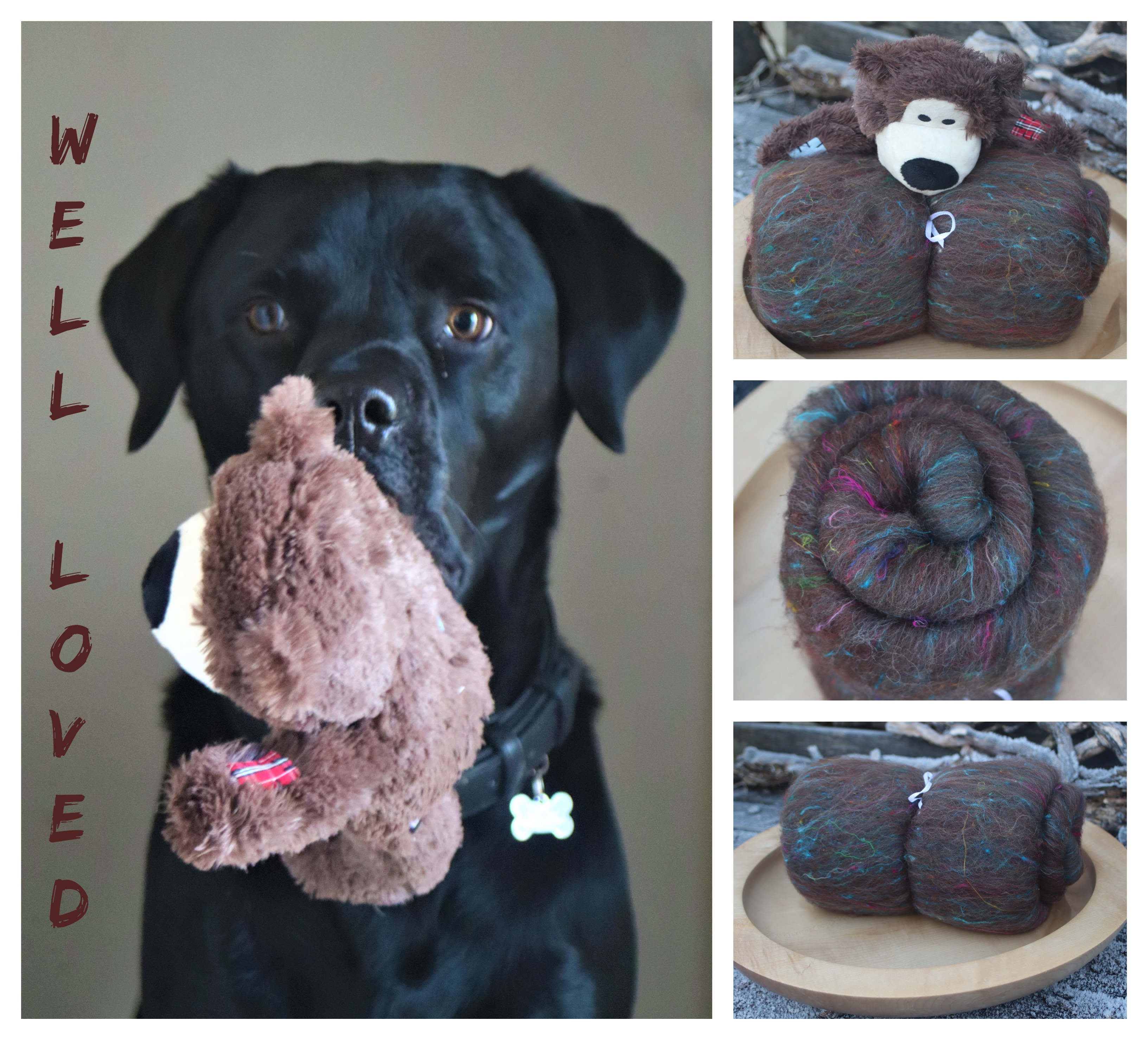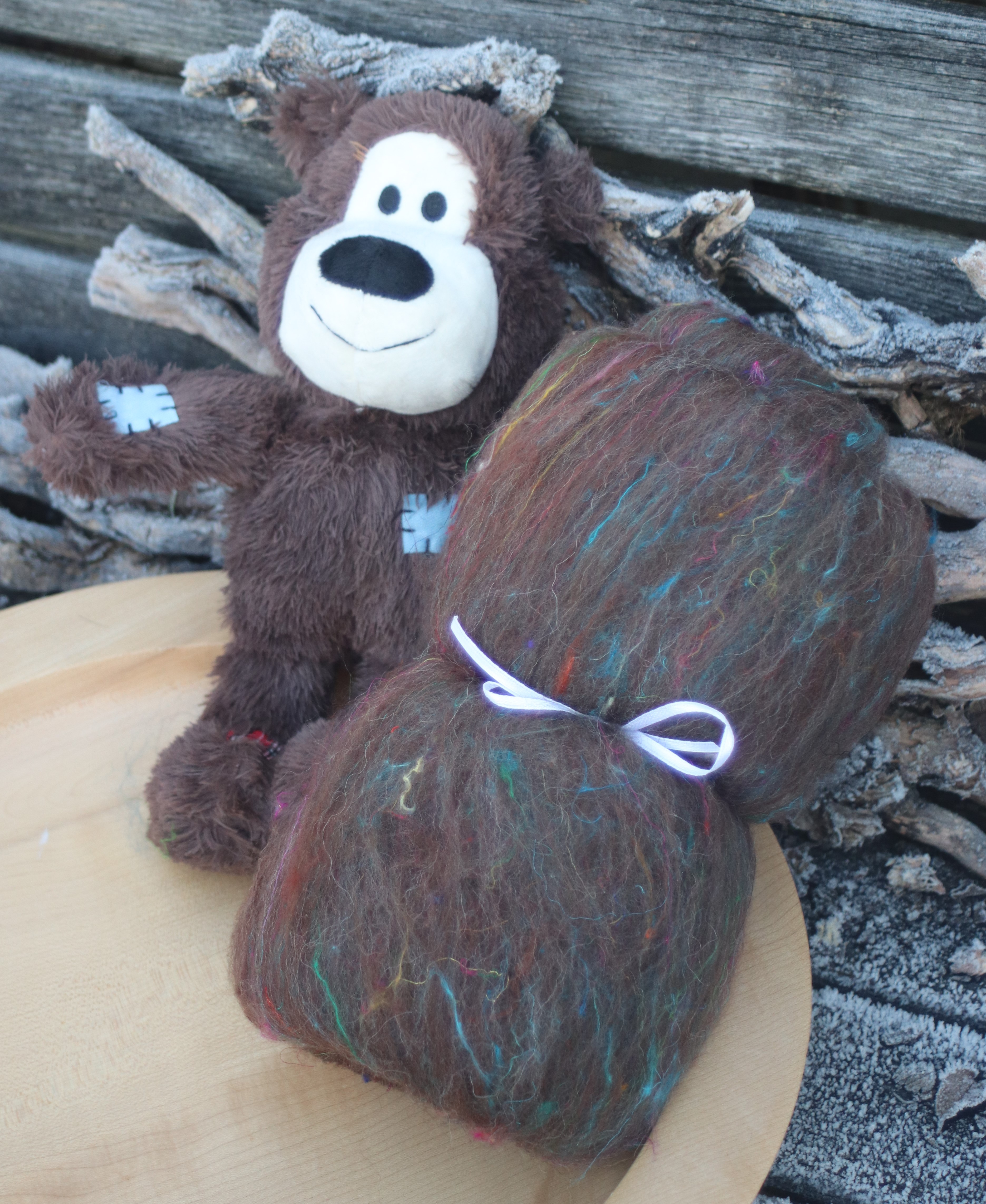 I made this blend for myself, with a specific aim in mind - my BIG puppy loves to play with his favourite teddy, which I love to, a deep brown with bright patches. I want to make myself a matching bear hat for cold walks - only I have a problem, at the moment I find it difficult to spin anything other than laceweight! So, I had two problems to overcome, how to get the pops of colour to represent the patches, and how to make it easier to spin thicker?