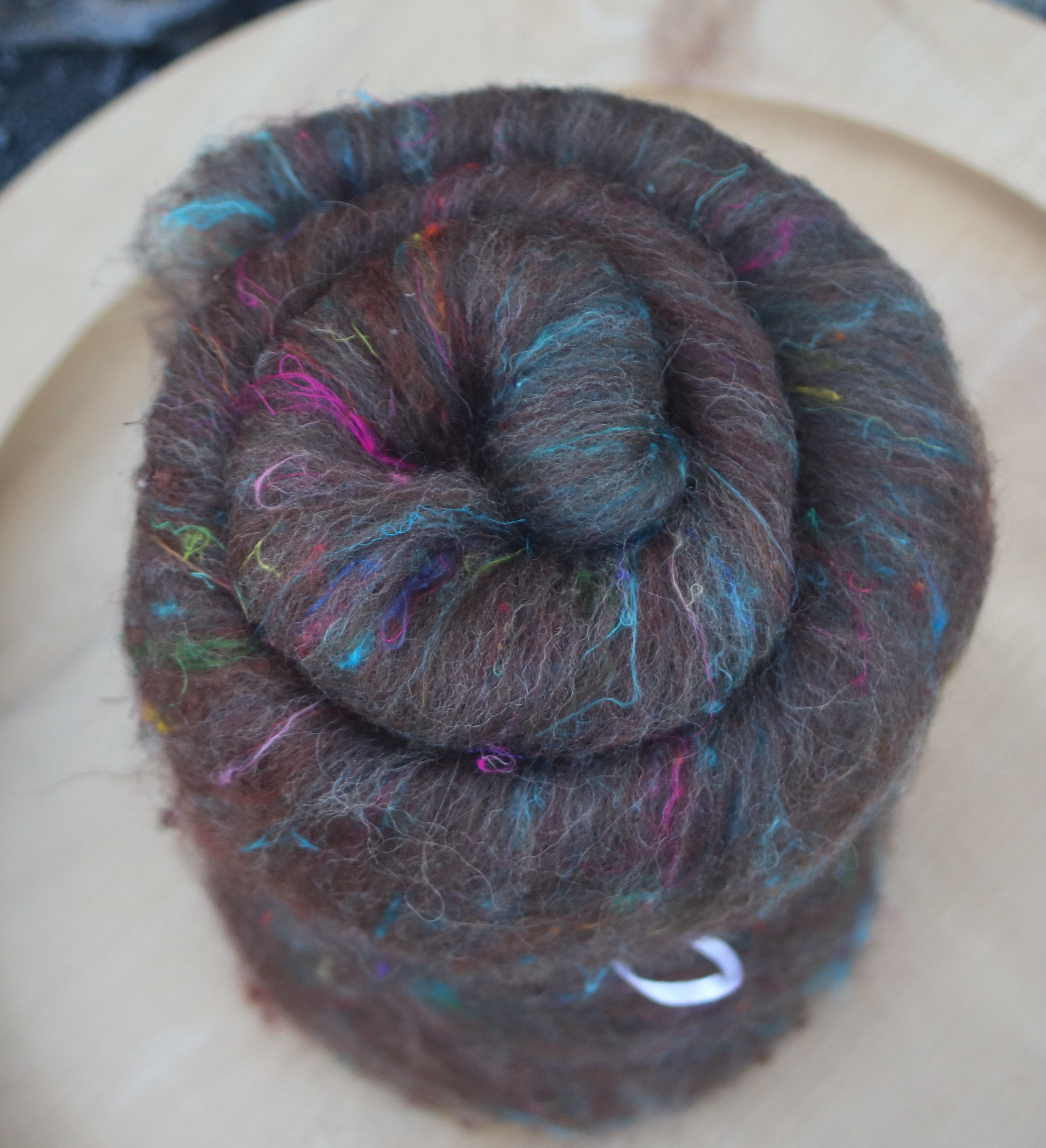 For the base colour I have used a blend of wonderfully bouncy Merino D'Arles with a little chestnut merino for colour and some Masham. I have added the Masham as the Merino D'Arles has a short staple length, and I wanted something with a longer staple length to make it easier to spin. These fibres and the batt preparation I hope will help me spin a nice chunky yarm - fingers crossed!