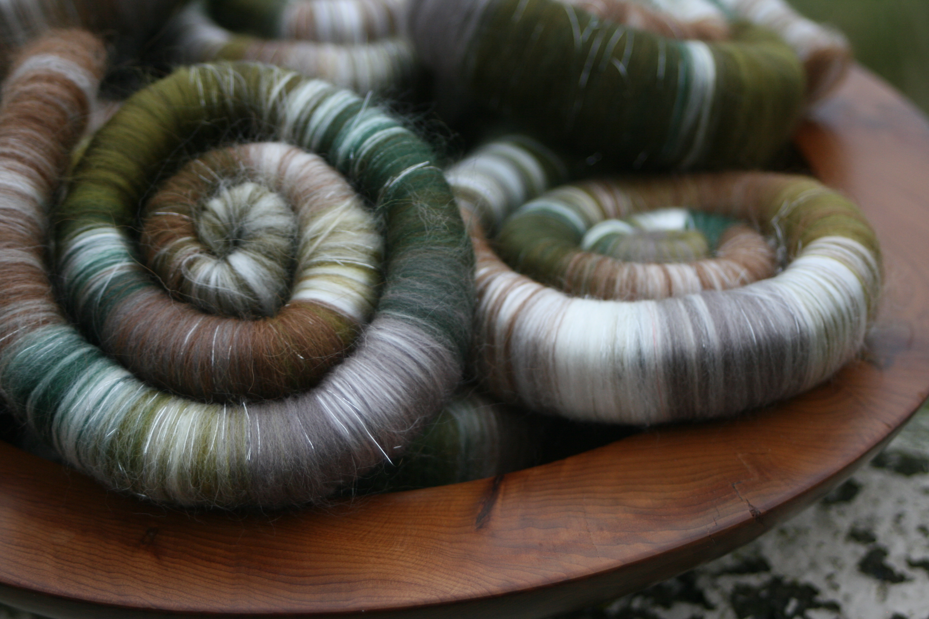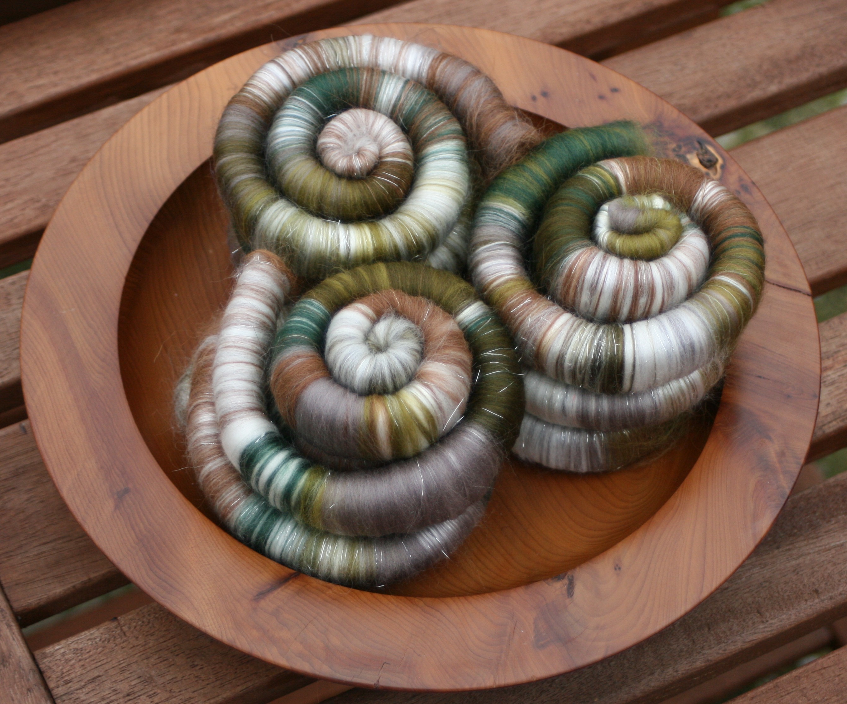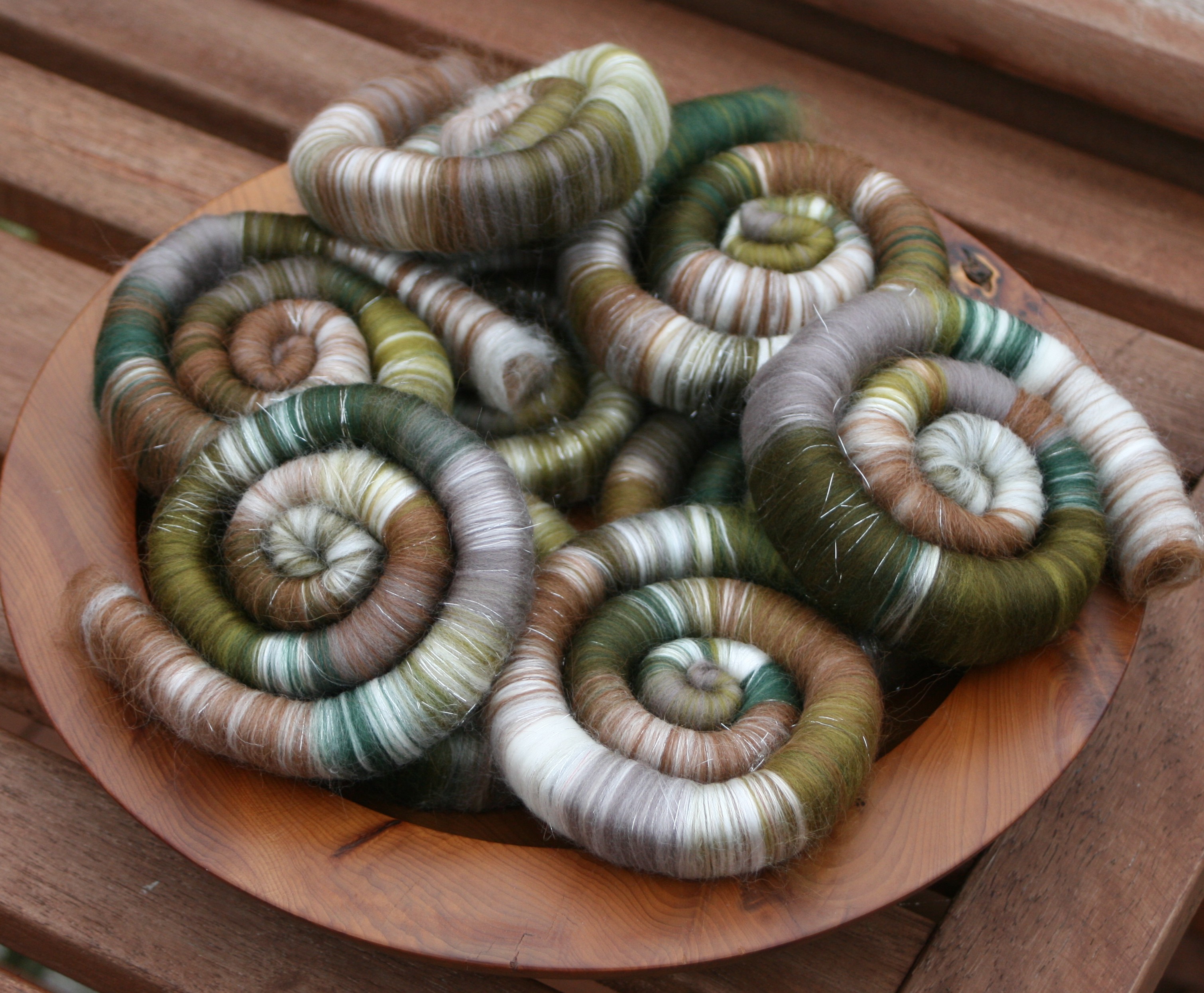 These luscious rolags / punis are made of chestnut brown baby alpaca, superfine white merino and cashmere, 21 micron merino in shades of grey and green - with a little silver Angelina for added sparkle.