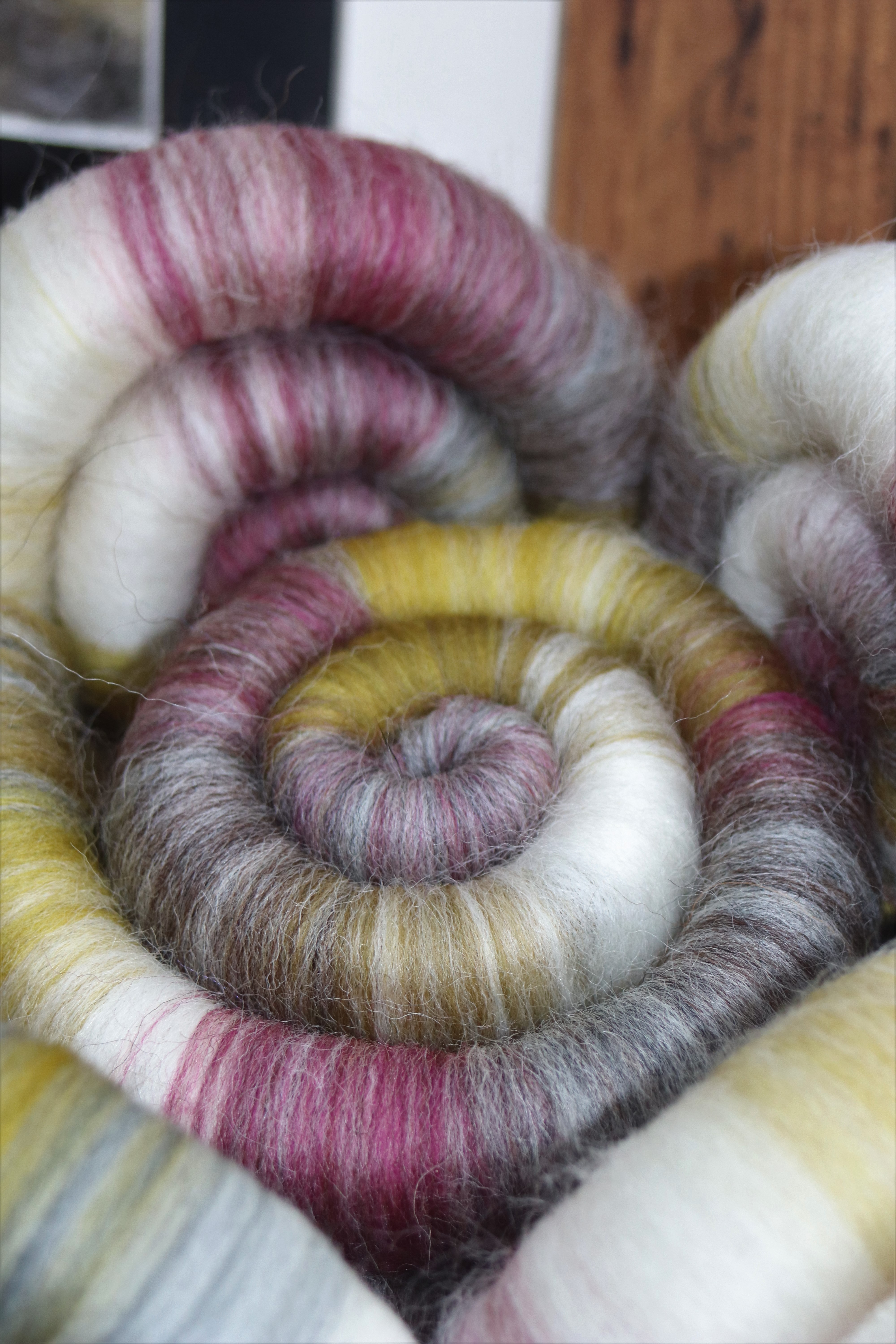 These rolags are made from Exmoor Blueface (a cross between Exmoor horn sheep and BFL), corridale, masham and merino. I would class this blend as 'medium'. I could not wear this blend around my neck, but I would be very happy to wear it as a hat or gloves.