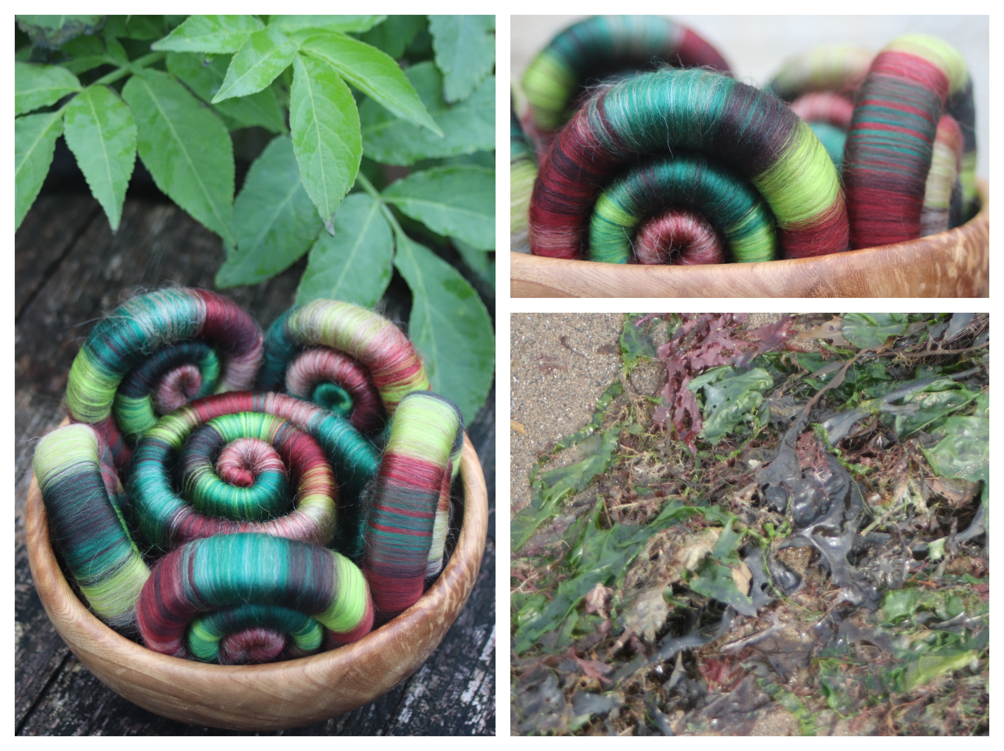 To make these rolags, I have blended merino fibre with a similar colour of silk (to get the shine of the seaweed). Each batt has 25% silk (either tussah or mulberry) 75% merino. The Manx Loaghton was also blended in the same ratio with natural honey tussha silk.