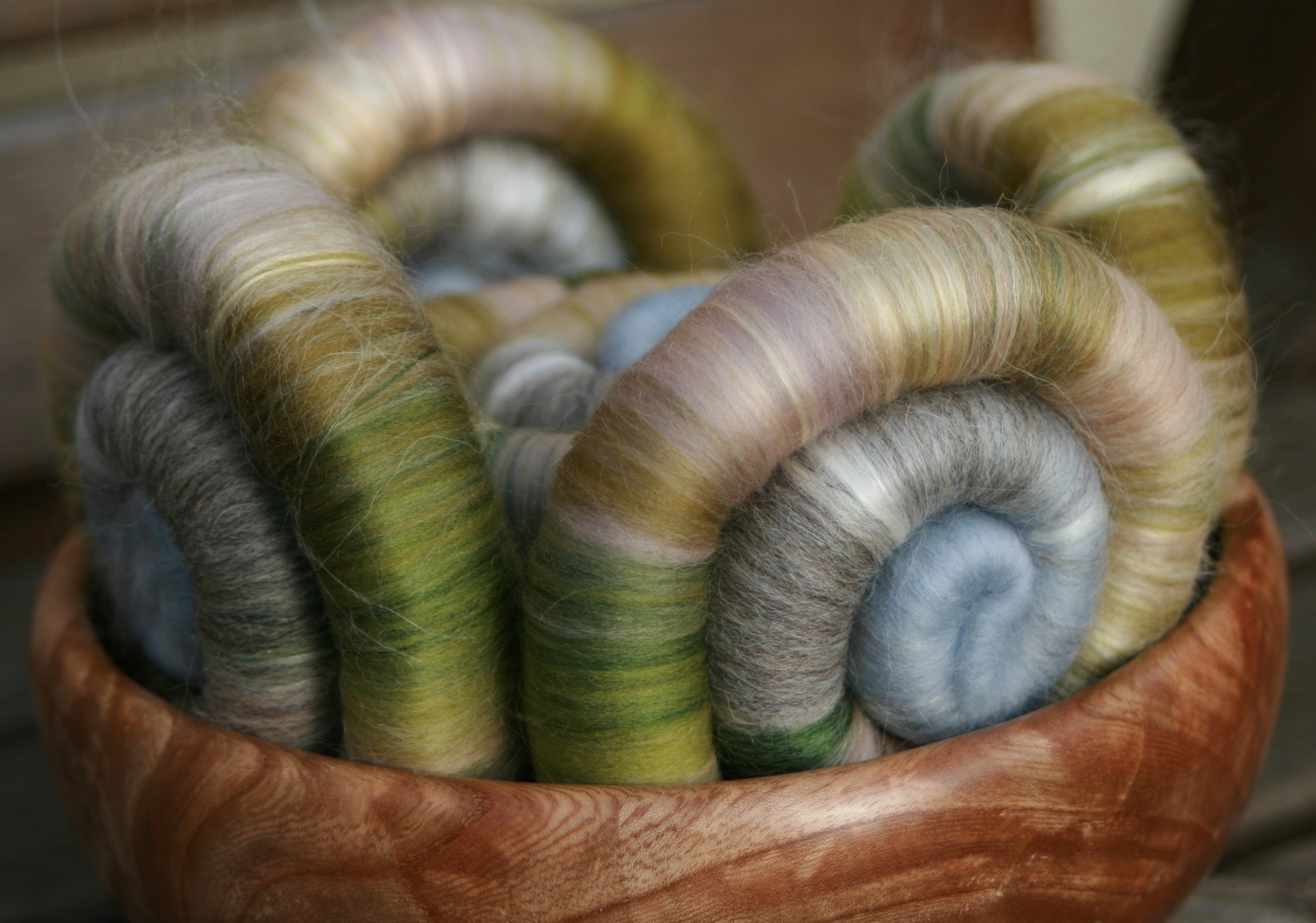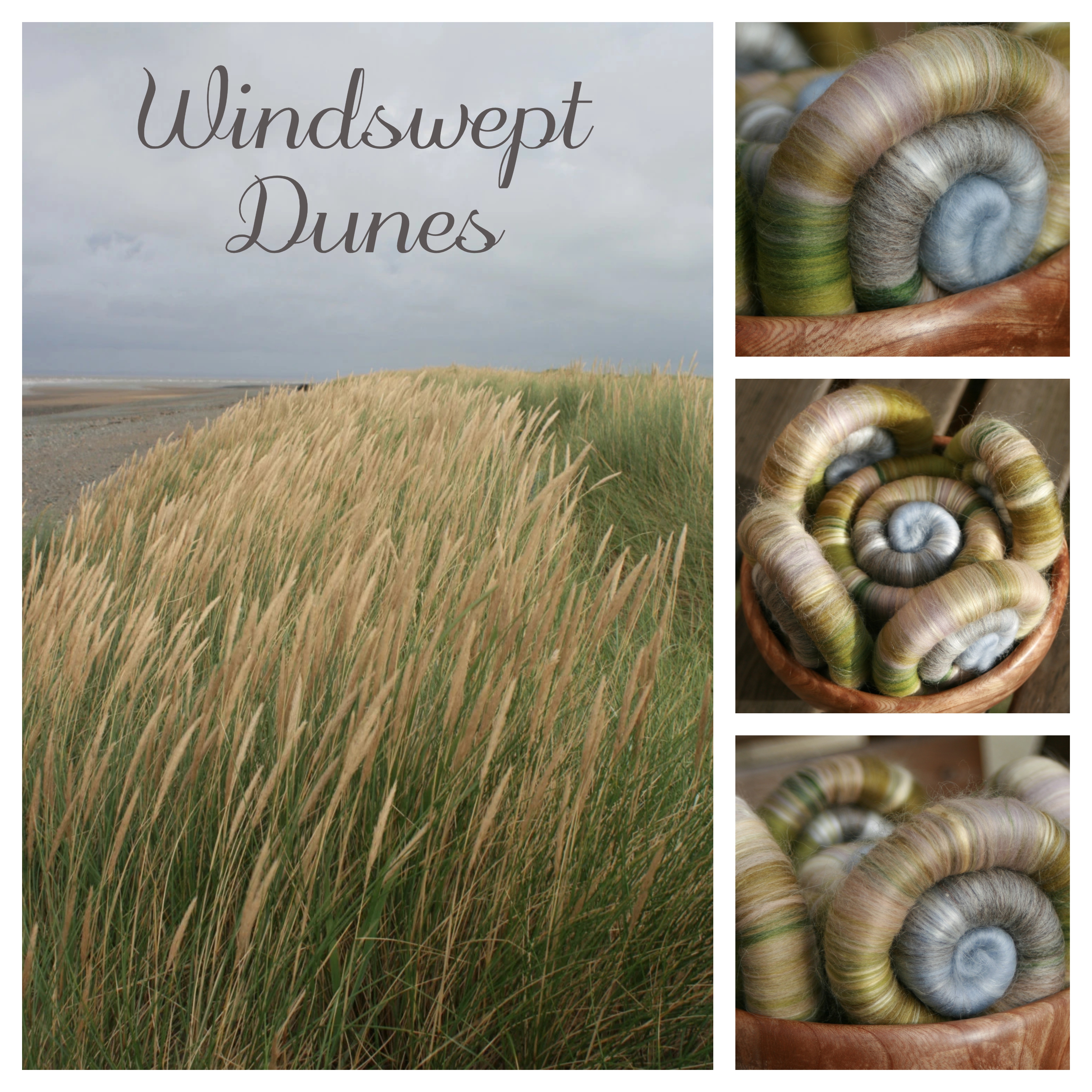 These rolags reflect the transition from the shore to the dunes. With the tough, hardy grasses blowing in the what seems like constant wind. The rolags are made of merino in shades of greys and green, natural grey Shetland, ramie, unbleached soysilk, fawn baby alpaca and green tussah silk.
