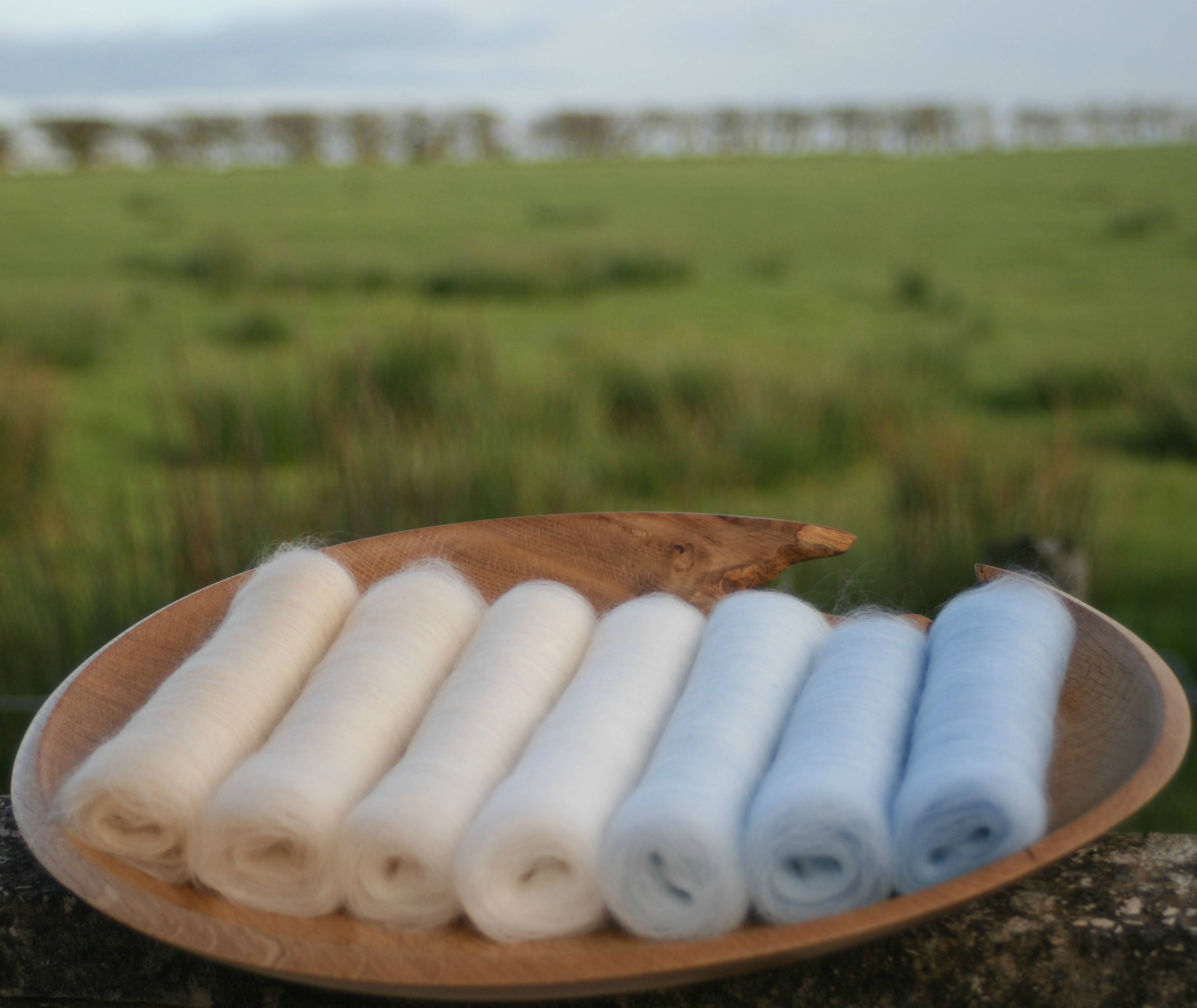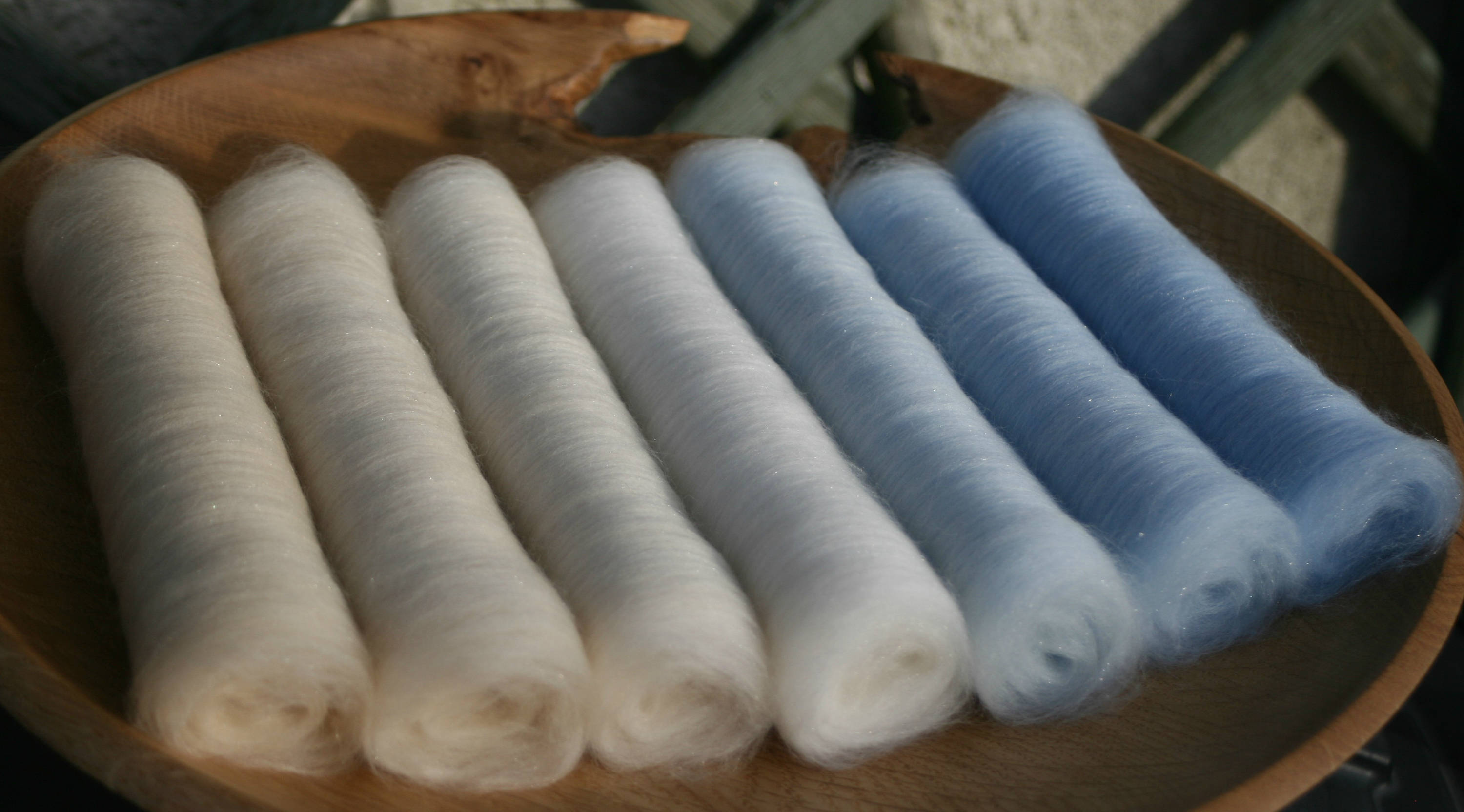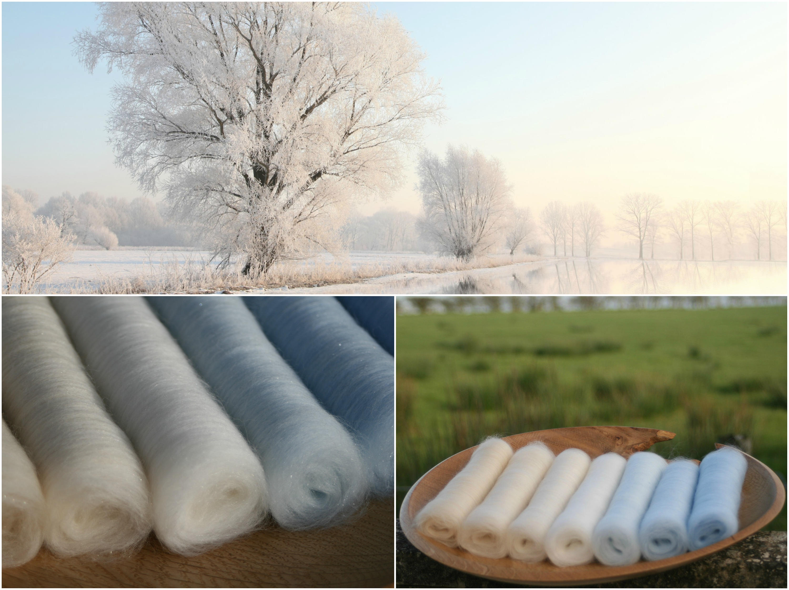 This set of seven mini batts is made from merino and a small amount of trilobal carefully blended together. I addded a small amount of trilobal to the blend to add a slight glimmer of sparkle to the fibre, to give the suggestion of frost. Unlike Angelina, it has no colour, it just glints slightly in the sun. It also has a very fine denier, so should not irritate the skin. However, if you prefer not to have the trilobal in your blend, you can just choose that option at purchase.