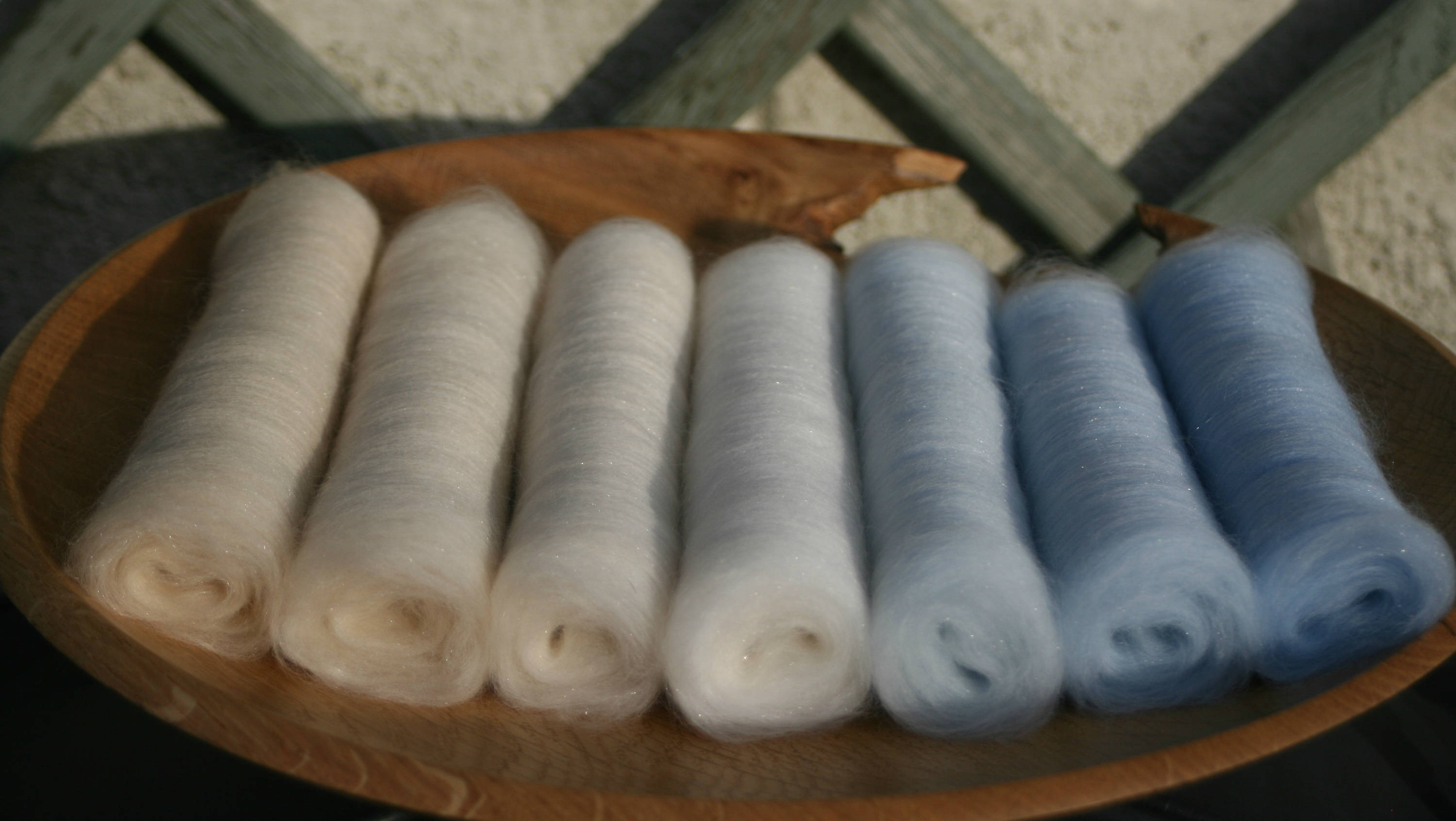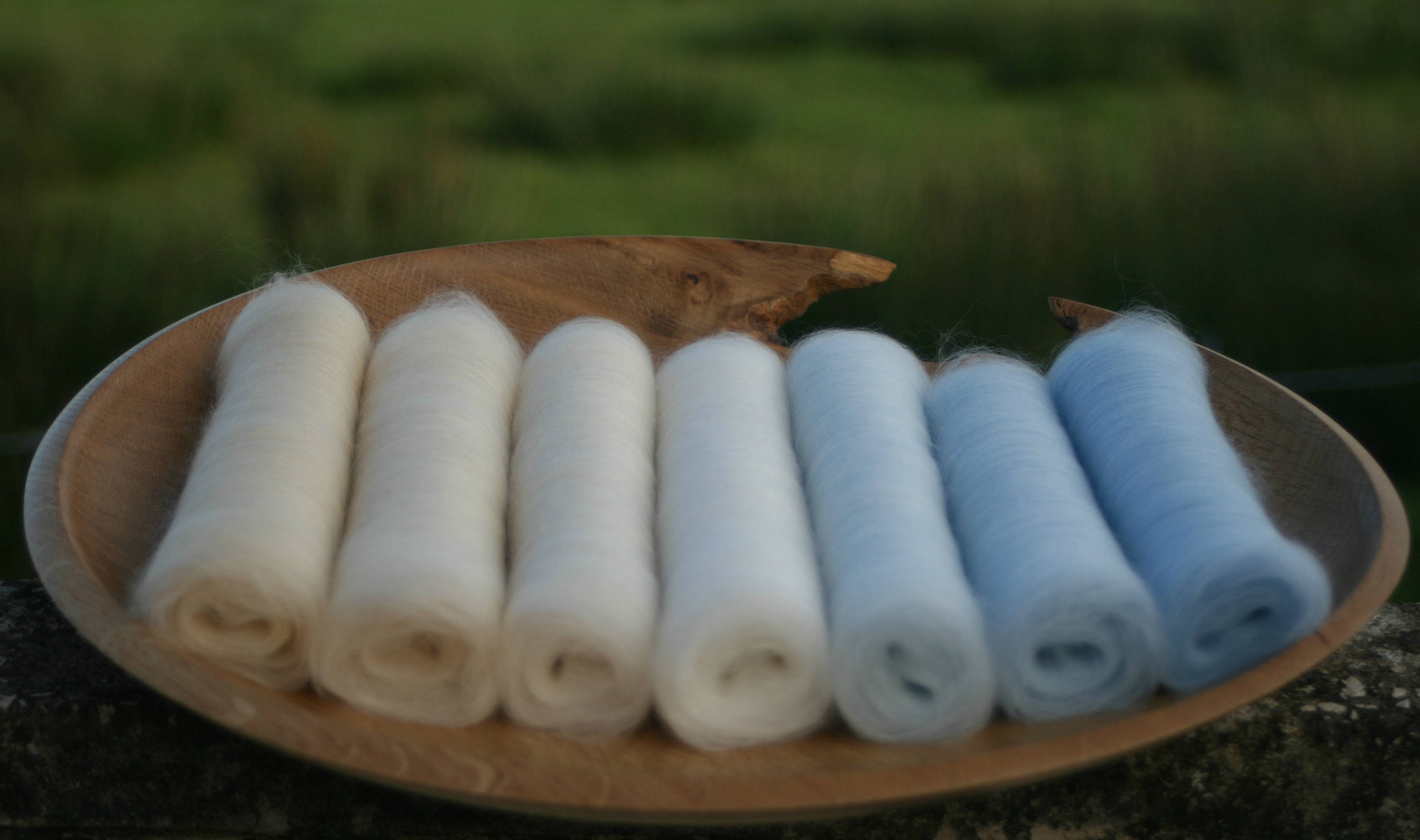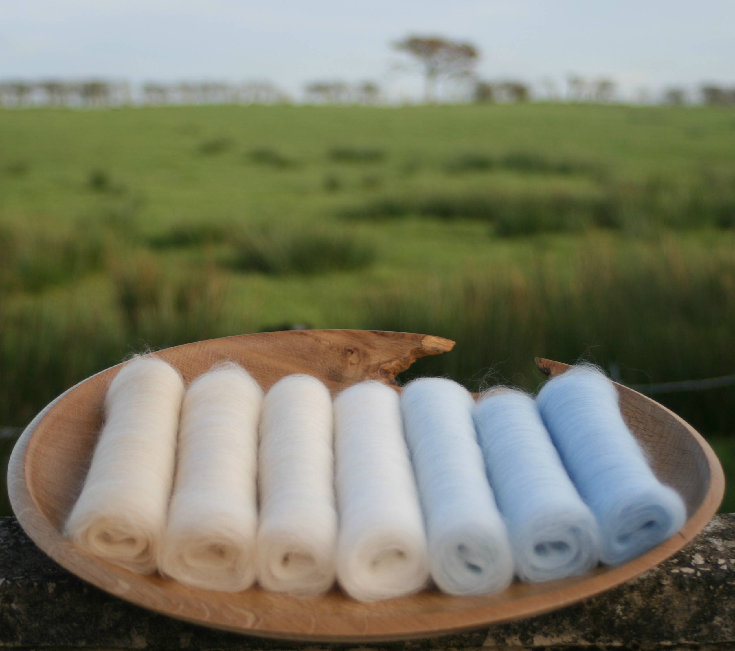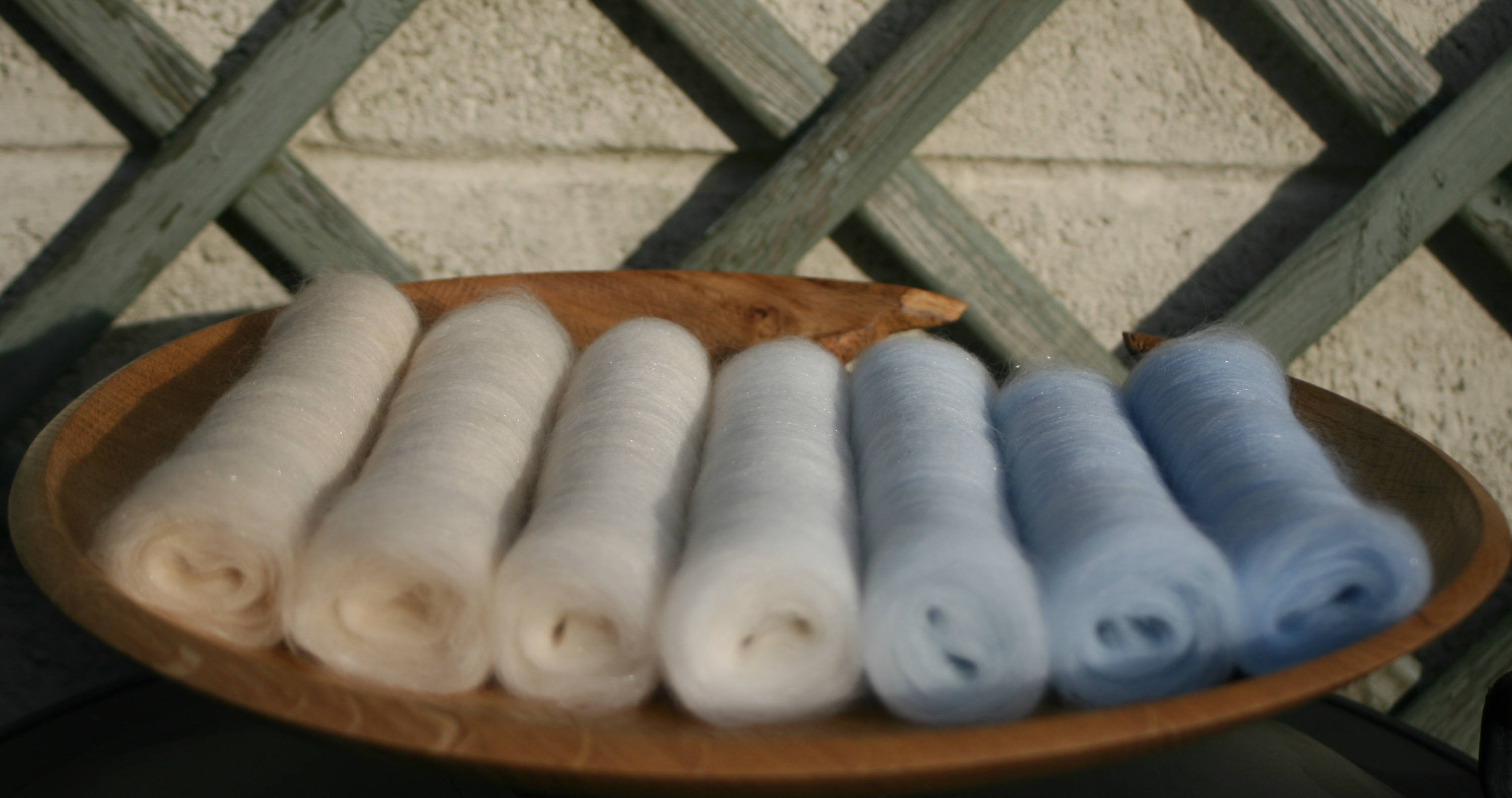 This set of seven mini batts is made from merino and a small amount of trilobal carefully blended together. I addded a small amount of trilobal to the blend to add a slight glimmer of sparkle to the fibre, to give the suggestion of frost. Unlike Angelina, it has no colour, it just glints slightly in the sun. It also has a very fine denier, so should not irritate the skin. However, if you prefer not to have the trilobal in your blend, you can just choose that option at purchase.